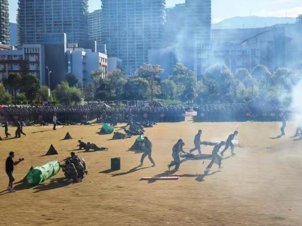 在军训成果展示环节,参训新生依次进行了队列、军姿、格斗术、军体拳、战术动作等军事科目汇报表演。他们步伐整齐、口号响亮、动作刚劲,展现出良好的军事素养和青春蓬勃的朝气,赢得了现场阵阵热烈的掌声。