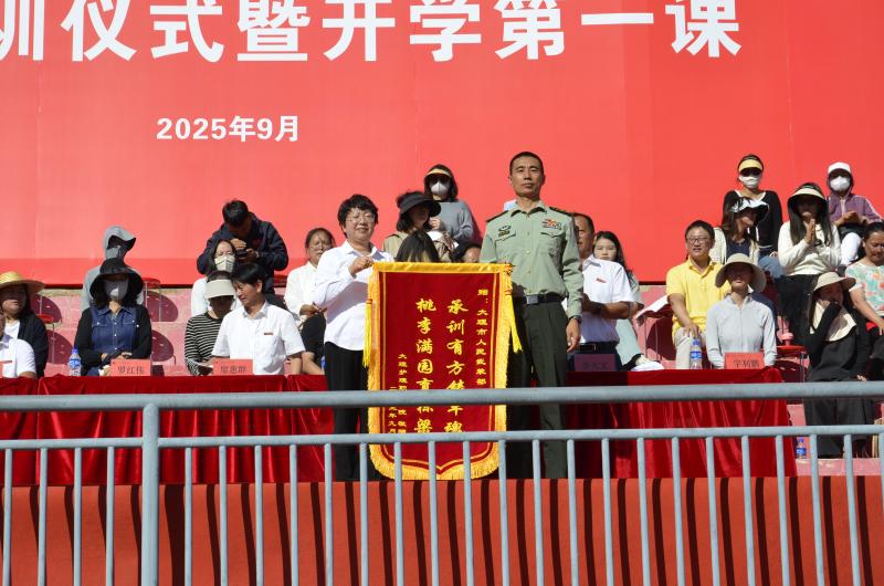 校党委书记廖惠群同志代表学校向承训单位大理市人民武装部赠送锦旗,感谢其对我校军训工作的大力支持与辛勤付出。校领导还为优秀教官代表和军训优秀学员代表颁奖,表彰他们在军训期间的出色表现。