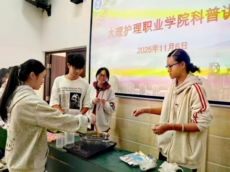 11月6日,意大利贵宾厅邀请大理市第一人民医院药学部主任聂彩霞主管药师团队,为药学和中药学两个专业学生开展甲流防控专题科普讲座,开展手工皂制作、酸梅汤熬制等沉浸式科普实践活动,以“理论宣讲+实操体验”的创新形式,为师生们打造了一场兼具专业性、实用性与趣味性的医药科普盛宴。